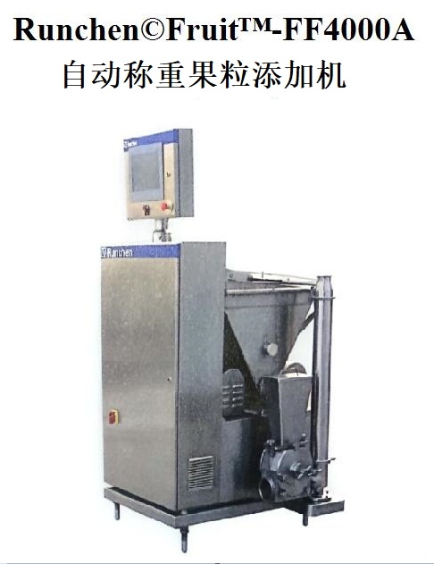 Runchen©FruitTM-FF4000A是一臺帶自動稱重系統(tǒng)的果粒添加機,完全滿足食品衛(wèi)生的需要。該設備由高品質(zhì)和高質(zhì)量的零部件組成,其設計達到嚴格的衛(wèi)生、可靠及耐用的標準。所有和冰淇淋漿料接觸的零部件均由304不銹鋼加工。該機裝有腳輪,便于移動與安置。
